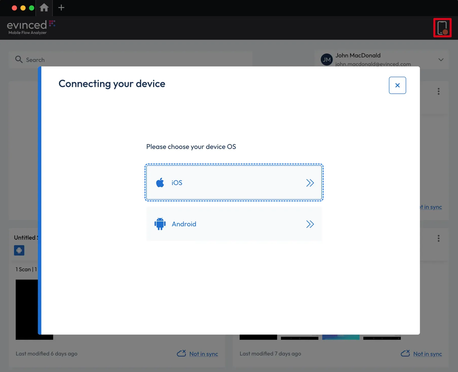 Evinced Mobile Flow Analyzer requires Xcode installed on an Apple computer running macOS to connect to an iOS device or simulator. You will need a free or paid Apple Developer account to connect to a real device.