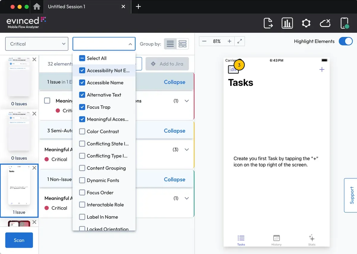 - In Mobile Flow Analyzer, click the “Scan” button to run an accessibility analysis of the screen in view on the mobile device.